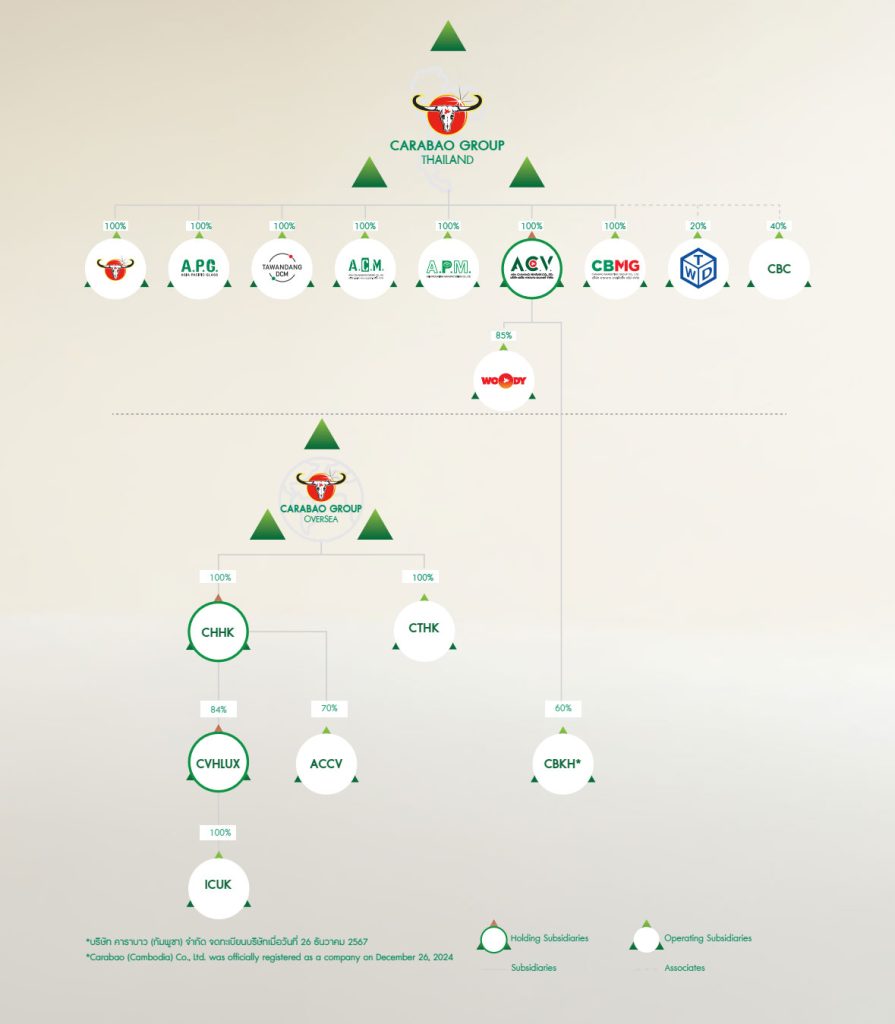 บริษัท คาราบาวกรุ๊ป จำกัด (มหาชน) (CBG) ดำเนินธุรกิจในรูปแบบบริษัทโฮลดิ้ง (Holding Company) โดยมีการลงทุนในบริษัทย่อยหลายแห่งที่ครอบคลุมกระบวนการผลิต การตลาด และการจัดจำหน่ายเครื่องดื่มและผลิตภัณฑ์ที่เกี่ยวข้อง ทั้งในประเทศและต่างประเทศ