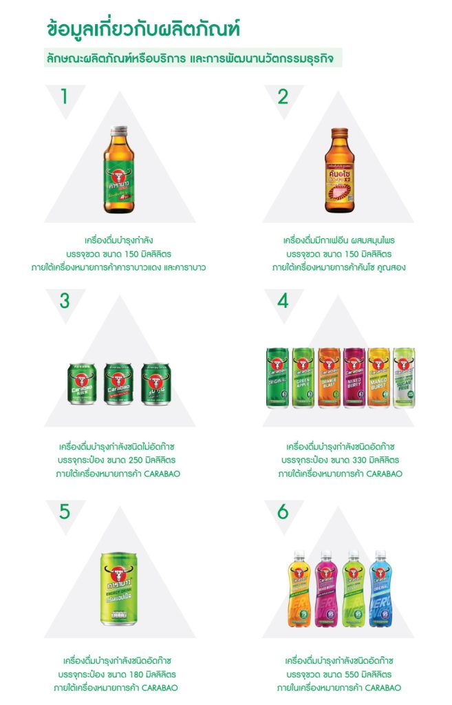 ดำเนินธุรกิจผลิต การตลาด และจำหน่ายเครื่องดื่มบำรุงกำลังภายใต้แบรนด์ “คาราบาวแดง” และเครื่องดื่มอื่นๆ